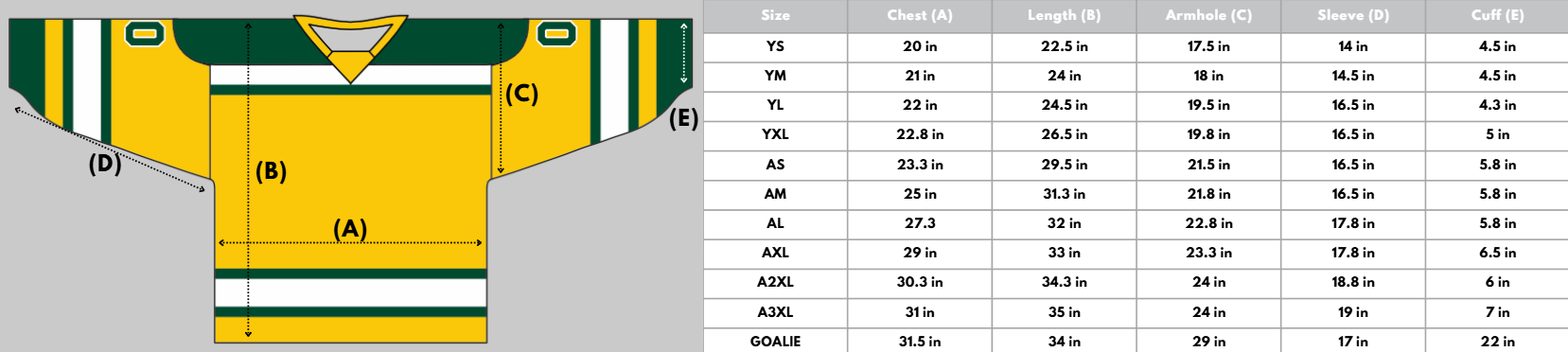 Please note: the measurements provided are based on an ice hockey fit. Ball hockey jerseys are designed to fit more snugly. For the most accurate sizing, we recommend visiting our store to try on a sample.